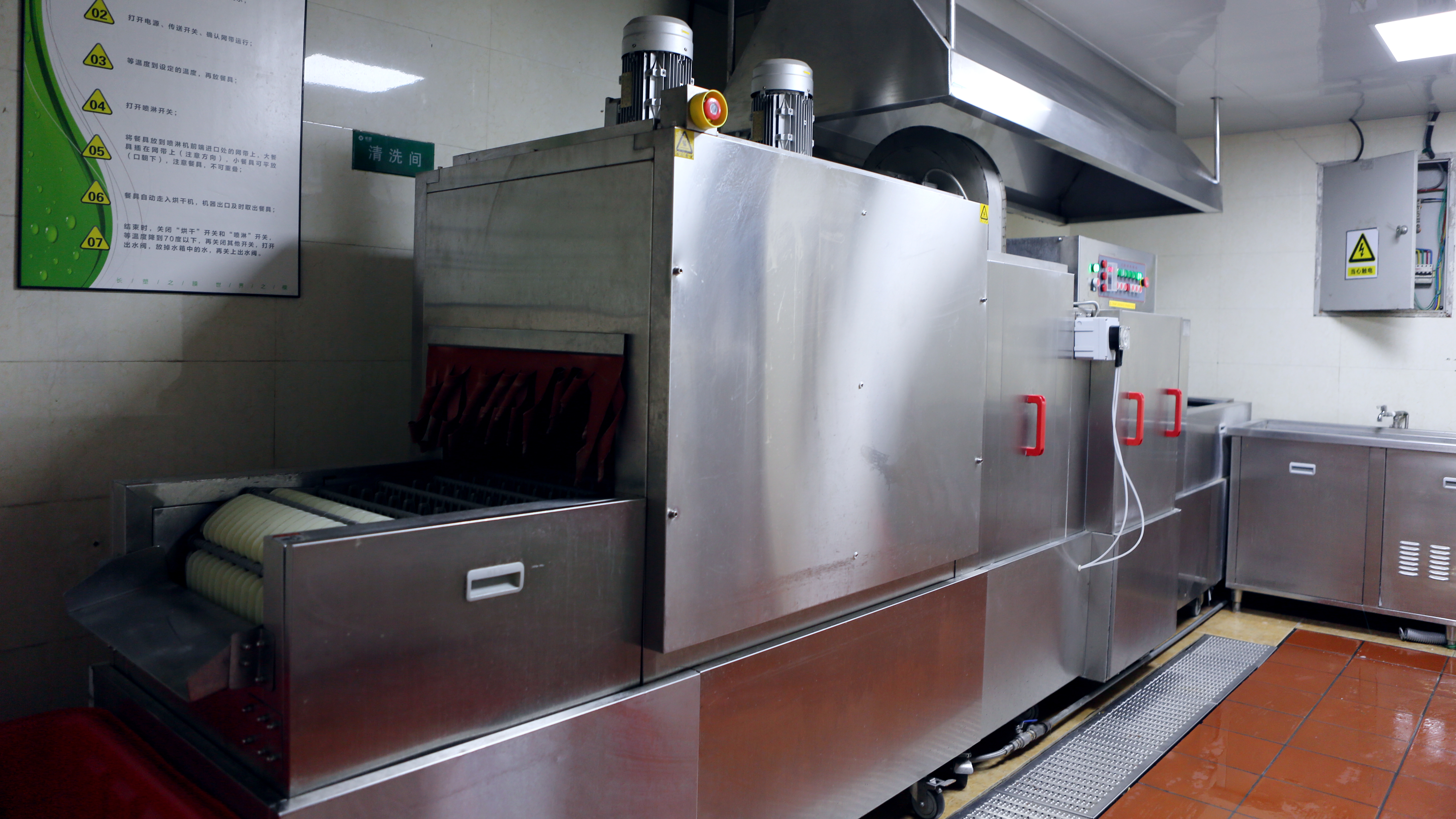 中侖食堂對使用過后的餐具嚴(yán)格遵循“一沖,二洗,三清潔,四消毒,五保潔”的工序,不僅選用知名品牌洗滌劑,做到干凈、整潔、無油漬、無飯?jiān)细衤什坏陀?span lang="EN-US">98%,還必須熱風(fēng)消毒40分鐘以上,由專人做好消殺記錄。